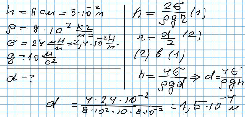 Визначити діаметр пор у гноті гасової лампи, по якому гас піднімається від дна до пальника на висоту 8 cm