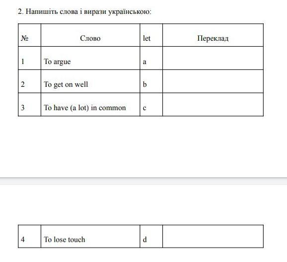 2завдання. To argue-сперечатися, To get on well-щоб добре влаштувалися, To have (a lot) in common-мати (багато) спільного, To lose touch-втратити зв'язок.