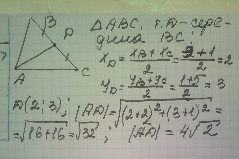 Отрезок AD – медиана треугольника АВС. Найдите модуль вектора А, если А(-2;-1); В(3;1); С (1;5)