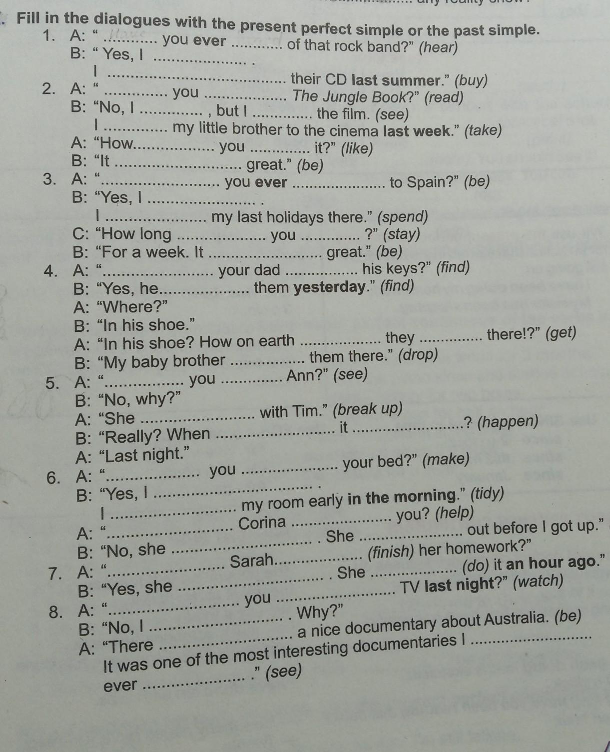 Срочно!! Fill in the dialogues with the present perfect simple or the past simple.