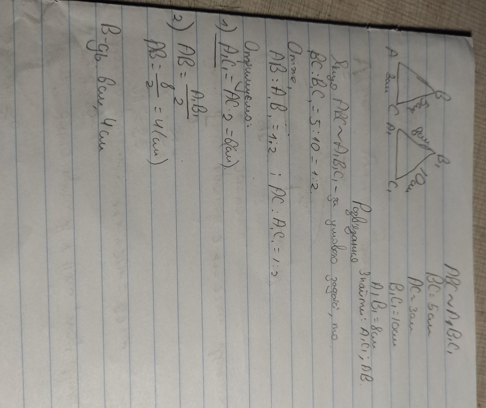 Трикутники АВС і А1 В1 С1 подібні. Знайдіть невідомі сторони трикутників якщо ВС=5 см, АС=3 см В1С1 =10 см, А1 В1=8 см