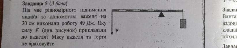 Під час рівномірного піднімання ящика за допомогою важеля на 20 см виконали роботу 49 Дж. Яку силу F (див. рисунок) прикладали до важеля? Масу важеля та тертя не враховуйте