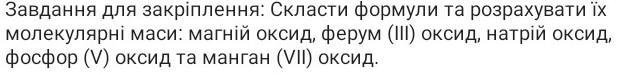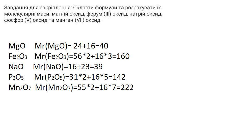 Задания для закрепления: Составить формулы то рассчитать их молекулярные массы: магний оксид ферум (III) оксид, натрий оксид, фосфор (V) оксид и манган (VII) оксид.