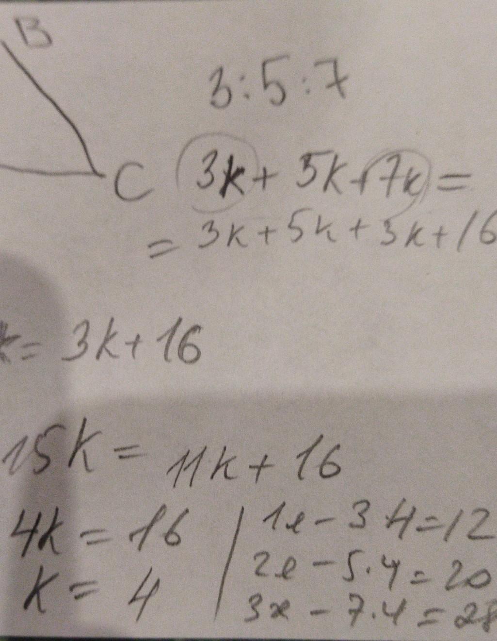 Знайди периметр трикутника, якщо його сторони пропорційні числам: 3, 5, 7. А найменша сторона коротша від найбільшої на 16 см.