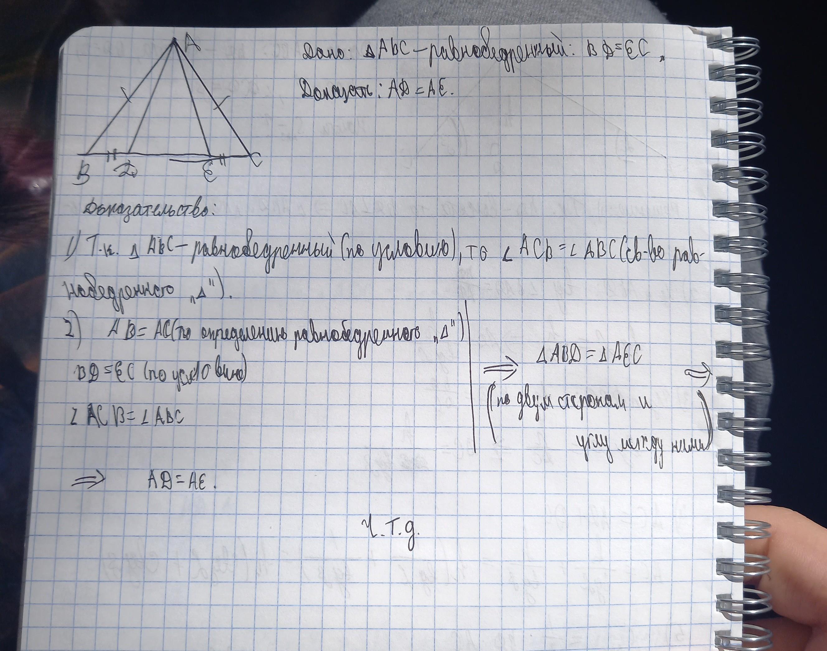 На основі ВС рівнобедренного трикутника АВС відкладені рівні відрізки BD та CE.