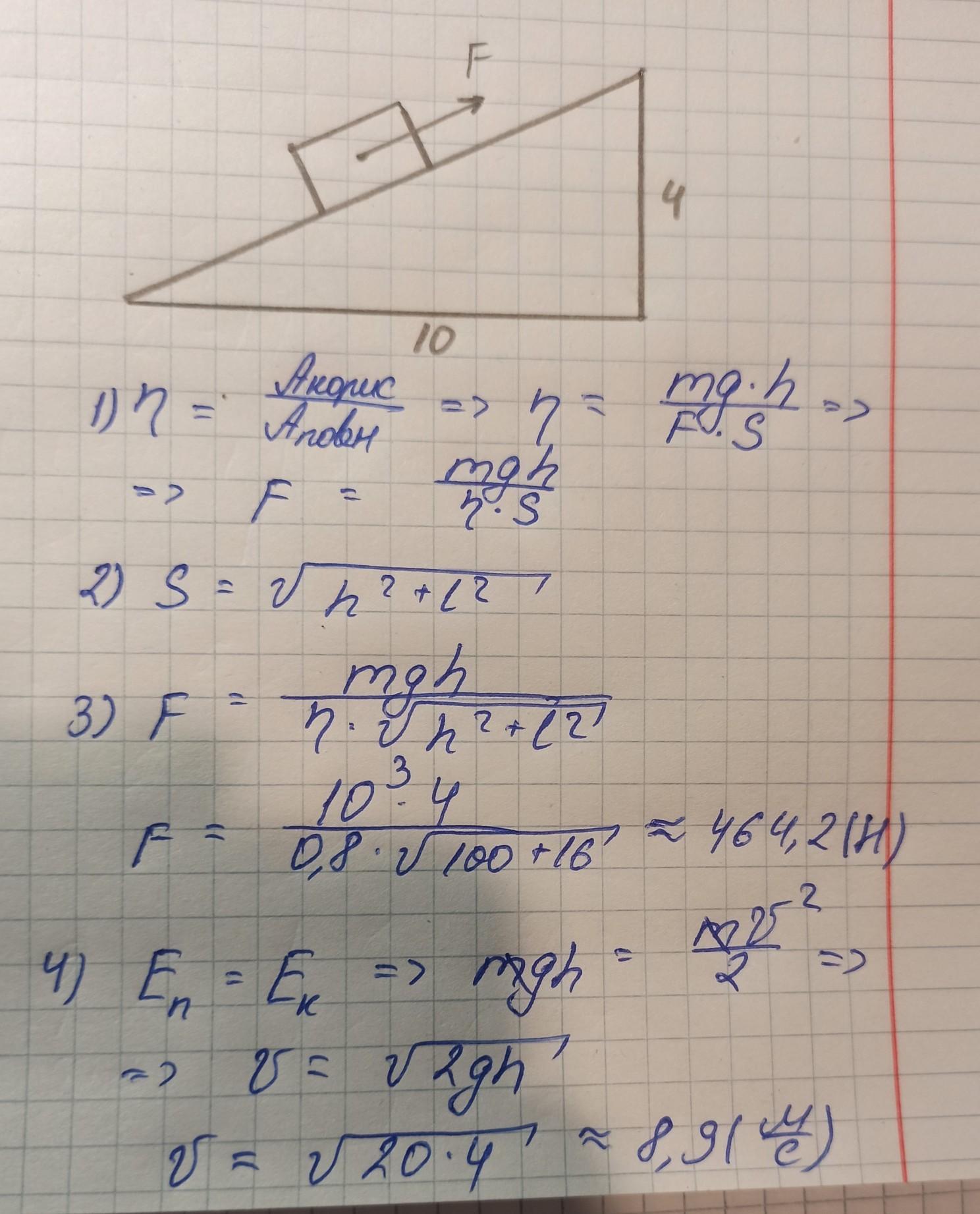 12. По похилій площині затягують вгору тіло масою 100кг. Яку силу при цьому прикладають? ККД площини 80%, її довжина 10м, а висота 4м. Якої швидкості досягло б тіло, зісковзуючи вниз із цієї площини, за відсутності сил тертя та опору повітря?