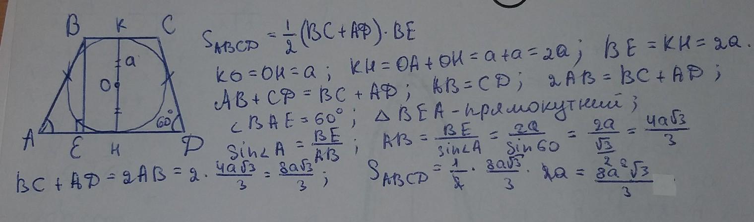 Радіус кола вписаного в рівнобічну трапецію дорівнює а, а один із кутів трапеції встановить 60° знайдіть площу трапеції