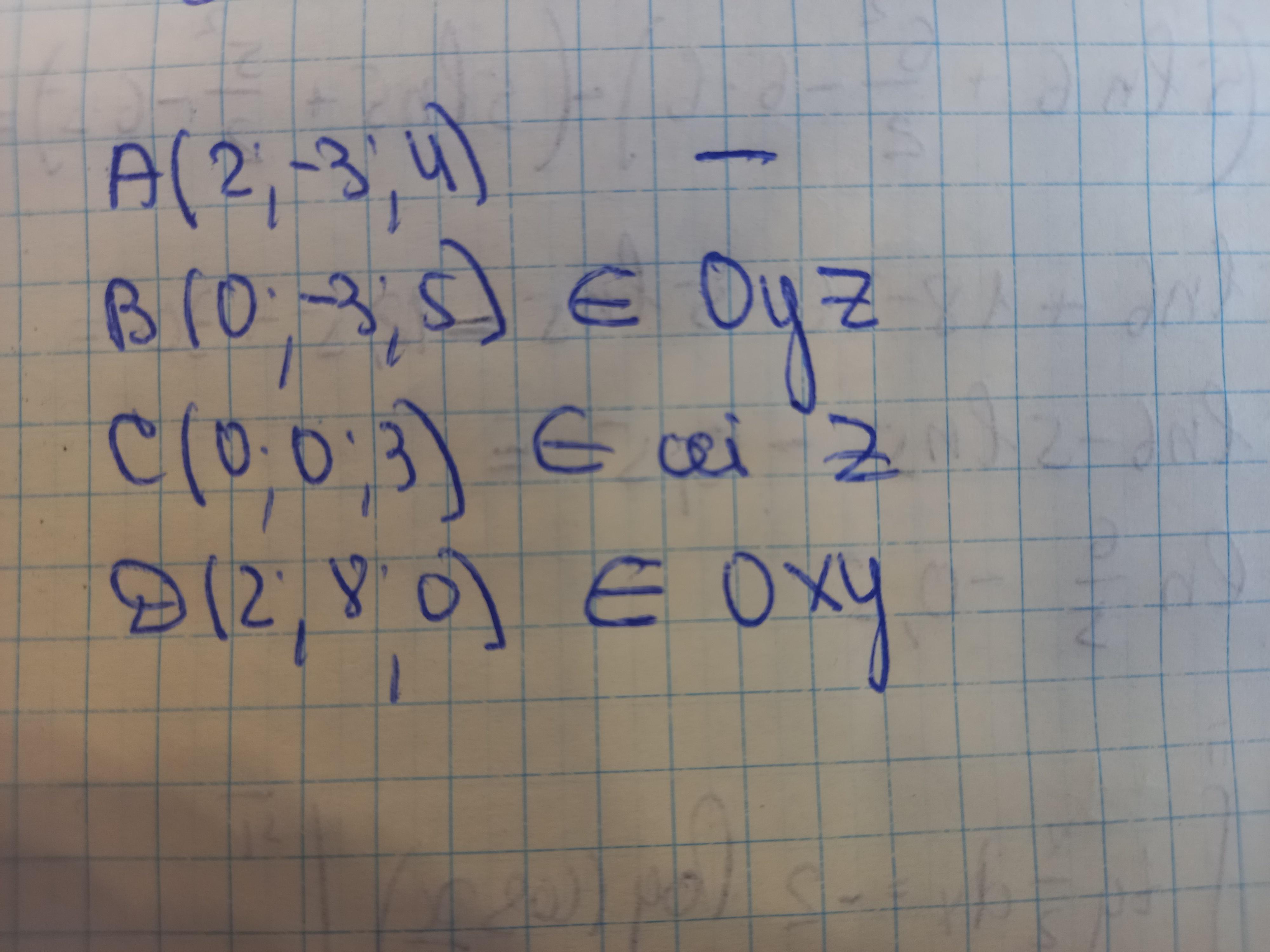 Дано точки А( 2;-3;4), В(0;-3;5), С(0; 0; 3) і D(2; 8; 0). Які з них лежать у площині: а) Оху;
