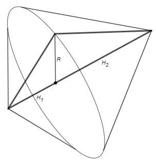 Если высота падает на сторону, то объемы конусов складываются, сумма высот конусов даст сторону a.