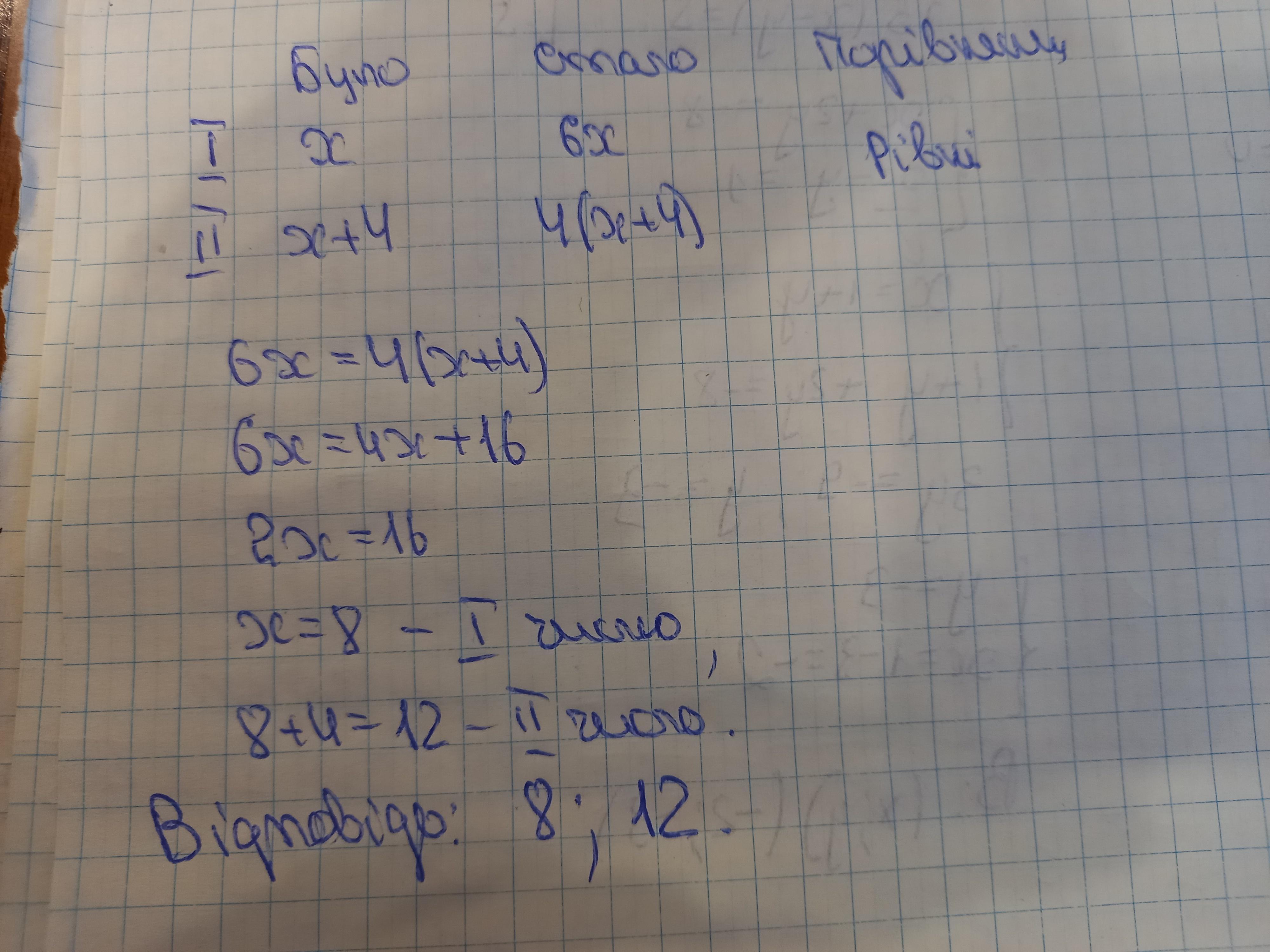 Перше число менше від другого на 4. Якщо перше число помножити на 6, а друге на 4, то отримаємо однакові результати. Знайди цi числа.