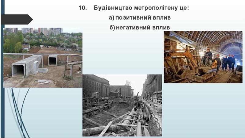 Позитивний вплив в том що розвивається місто,але в той же час будівництво метрополітену є негативним впливом,бо забруднюється екологія та довкіля