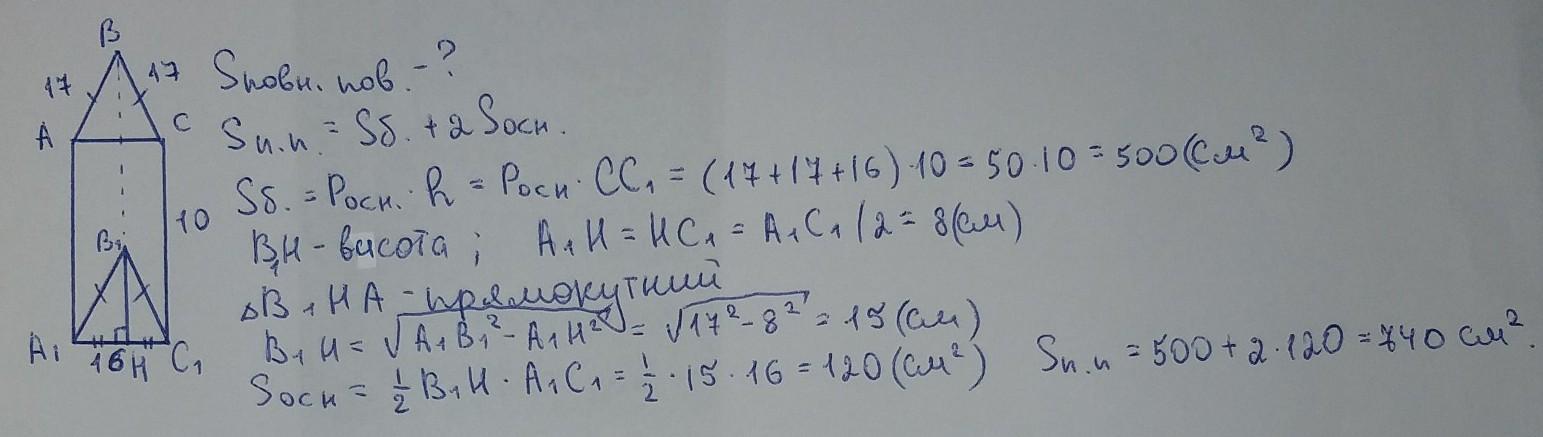 Осново ю примої прими є рібедрений трикутних бічна сторона якого 17 см, а основа -16 см. Знайдіть площу повної поверхні призми, якщо бічне ребро дорівнює 10 см.