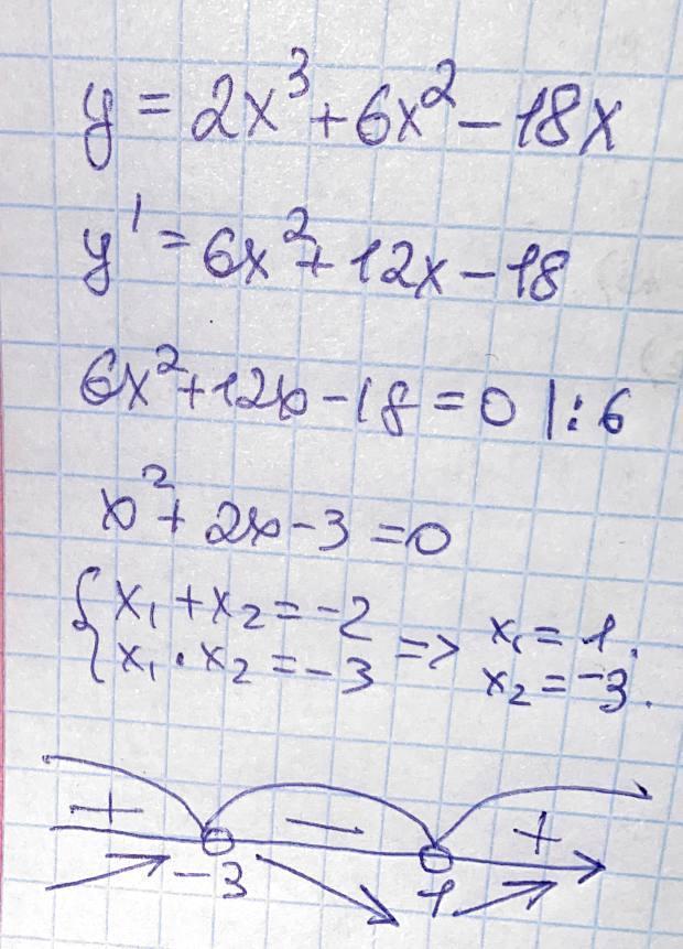 У точці x=-3 вона змінює знак з додатного на від'ємний, отже, це точка локального максимуму зі значенням функції f(-3)=54.