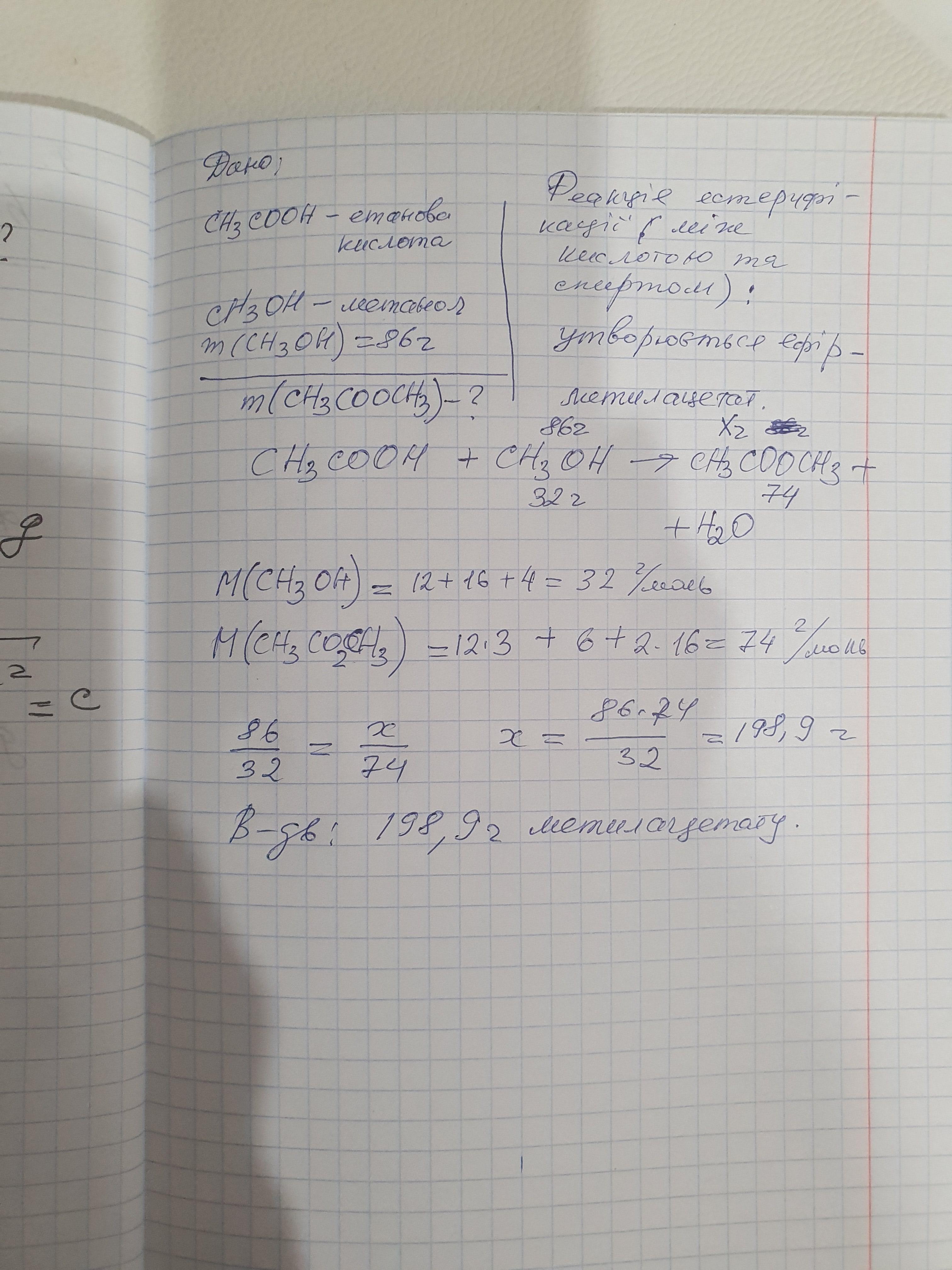 Розв'язання (визначення маси естеру - метилацетату) див. на фото.