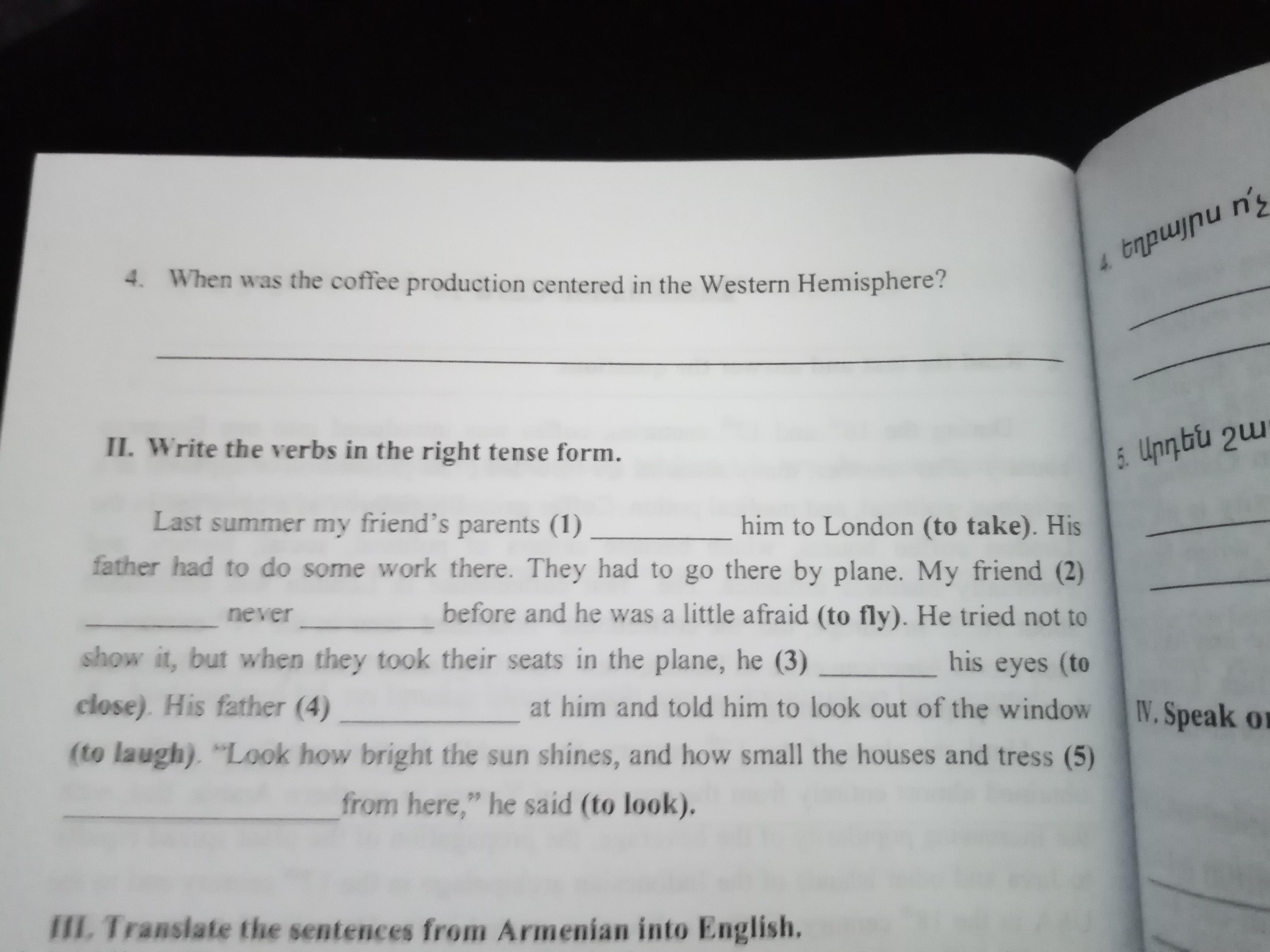 Last summer my friend's parents took him to London. His father had to do some work there. They had to go there by plane. My friend had never flown before and he was a little afraid. He tried not to show it, but when they took their seats in the plane, he closed his eyes. His father laughed at him and told him to look out of the window. "Look how bright the sun shines, and how small the houses and tress look from here, " he said.