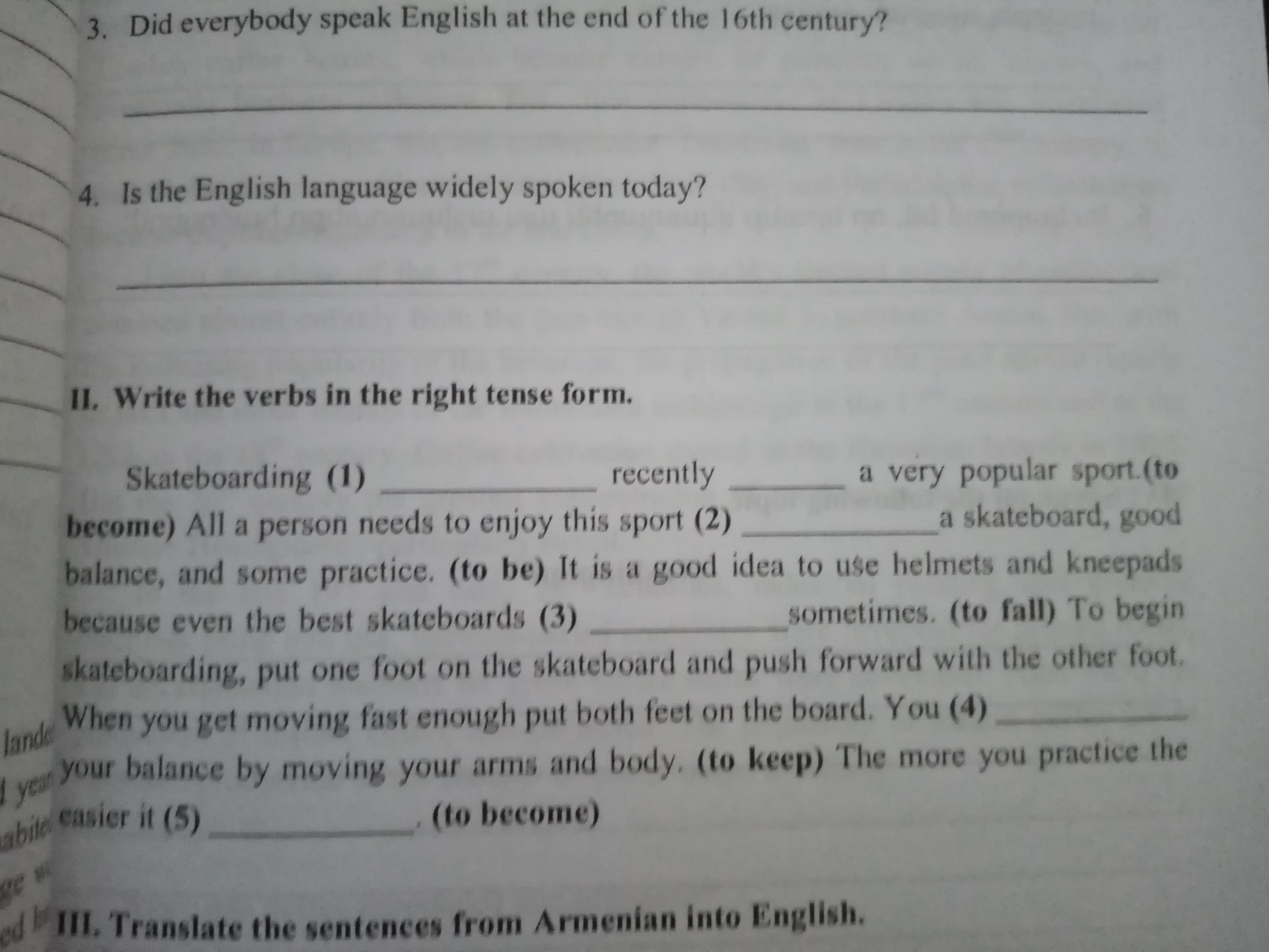 Skateboarding has become a very popular sport. All a person needs to enjoy this sport is a skateboard, good balance and some practice. It is a good idea to use safety helmets and kneepads because even the best skateboarders fall sometimes. To begin skateboarding, put one foot on the skateboard and push forward with the other foot. When you get moving fast enough put both feet on the board. You keep your balance by moving your arms and body. The more you practice the easier it becomes.