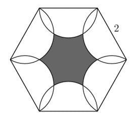 Как показано на рисунке, если 6 полуокружностей с диаметром 2 построены принимая сторону правильного шестиугольника как диаметр, найдите площадь закрашенной части.