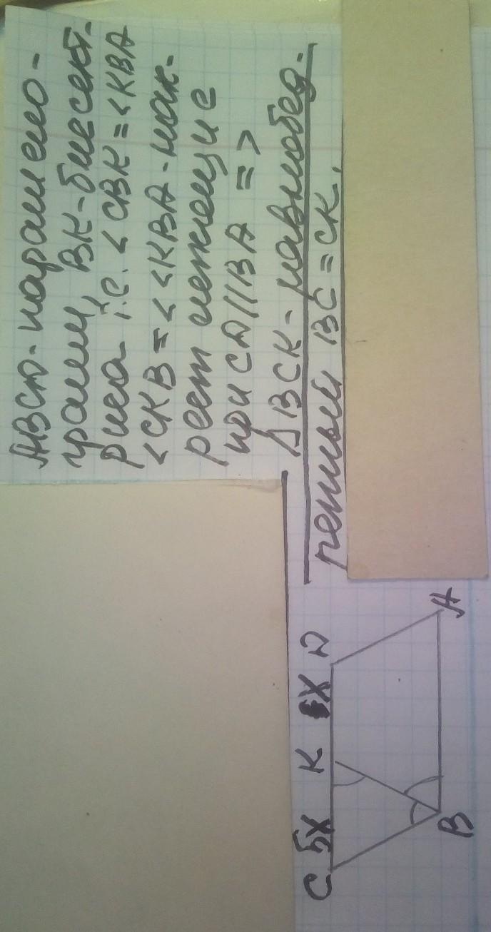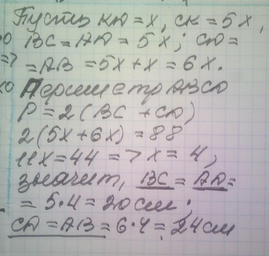 Бісектриса кута B паралелограма ABCD перетинає сторону CD у точці K так, що відрізок CK у 5 разів більший за відрізок KD. Знайдіть сторони паралелограма, якщо його периметр дорівнює 88 см.