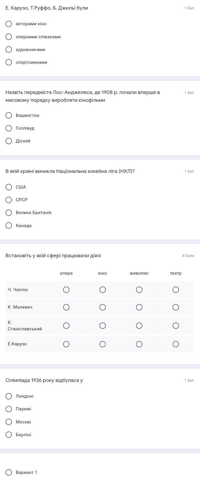 1)оперними співаками; 2)Голлівуд; 3)Канада; 3)Ч. Чаплін - кіно; К. Малевич - живопис; К. Станіславський - театр; Е. Карузо - опера; 4)у Берліні