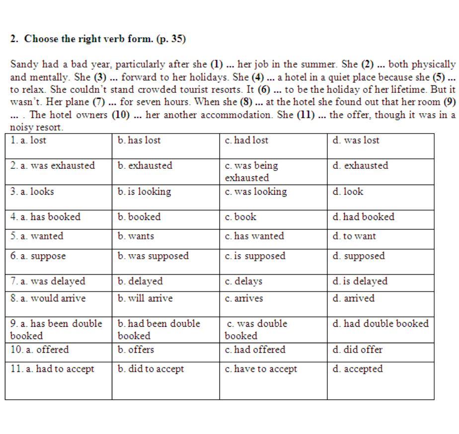 Sandy had a bad year, particularly after she had lost her job in the summer. She was exhausted both physically and mentally. She was looking forward to her holidays. She had looked a hotel in a quiet place because she wanted to relax. She couldn't stand crowded tourist resorts. it was supposed to be the holiday of her lifetime. But it wasn't. Her plane was delayed for seven hours. When she arrived at the hotel she found out that her room had been double booked. The hotel owners offered her another accommodation. She had to accept the offer, though it was in a noisy resort
