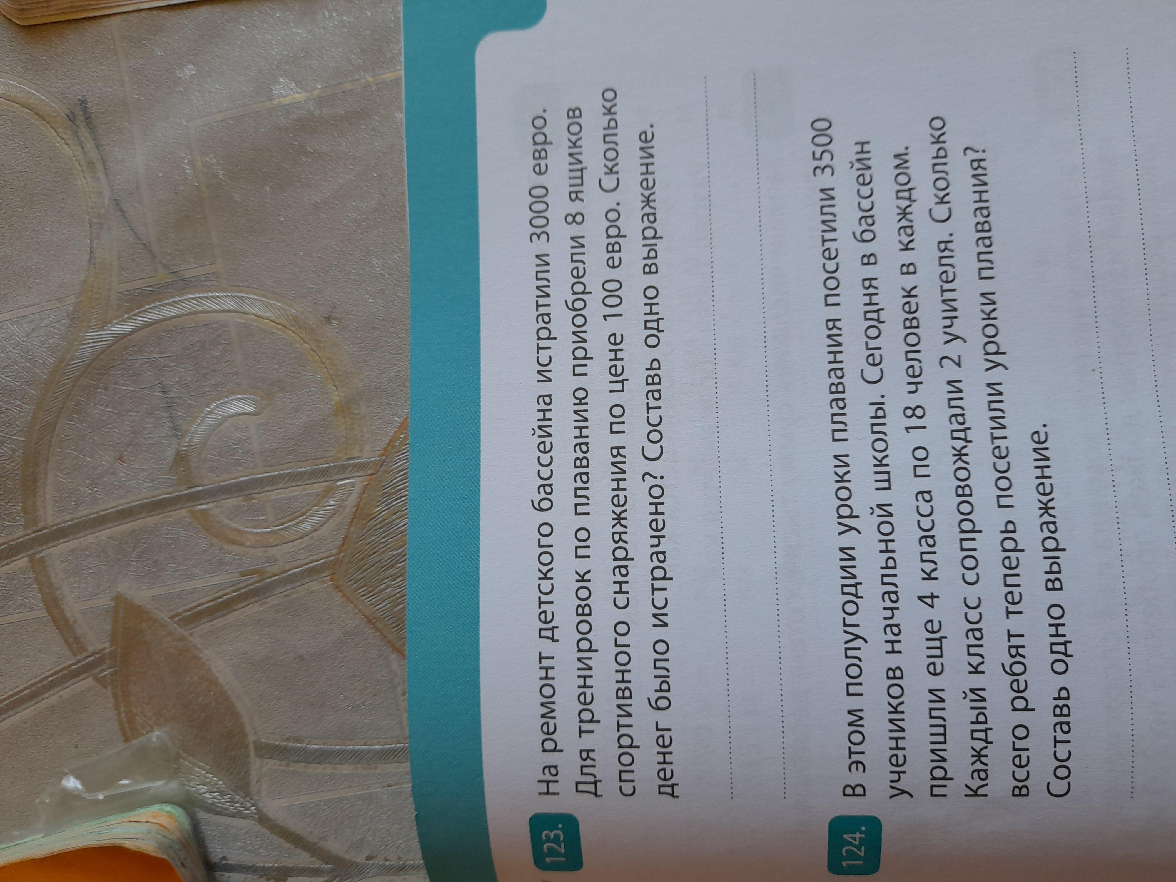 На ремонт детского бассейна истратили 3000 евро.Для тренеровок по плаванию приобрели 8 ящиков спортивного снаряжения по цене 100 евро. Сколько денег было истрачено? Составь одно выражение.