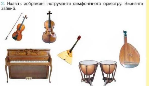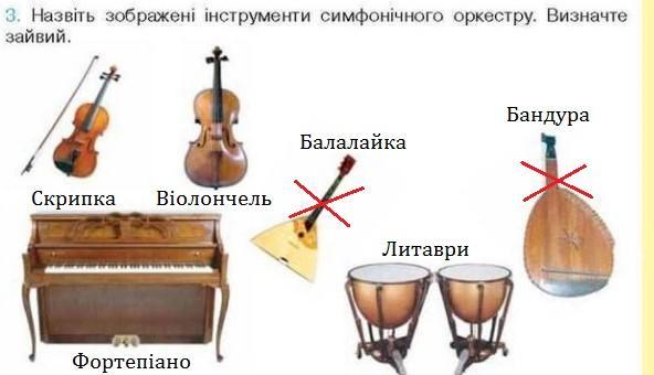 Скрипка, віолончель, фортепіано, литаври - інструменти симфонічного оркестру.