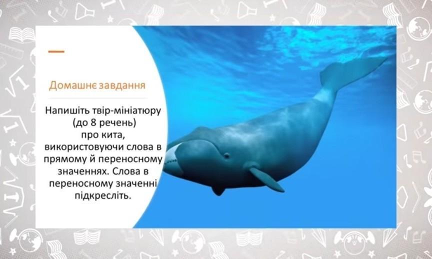 Объяснение: Мабуть, кожному за нас доводилося бачити кита хоча б з екранів телевізора. І його вигляд викликає море(переносне значення) вражень. Сильний та величезний ззовні з залізним(переносне значення) характером цей дивний звір. Але особливо вражає його зовсім не срібний(переносне значення) голос. Здається, що його можна почути навіть на іншому боці планети. Дуже незвичайна ця тварина!