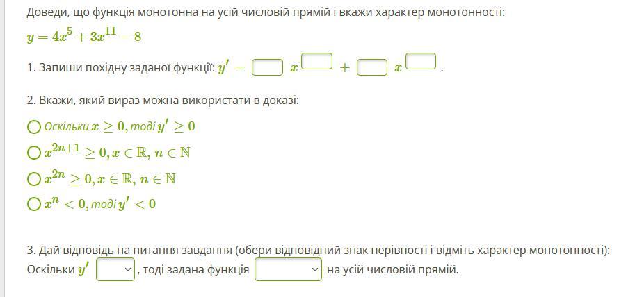 Доведи, що функція монотонна на усій числовій прямій і вкажи характер монотонності: