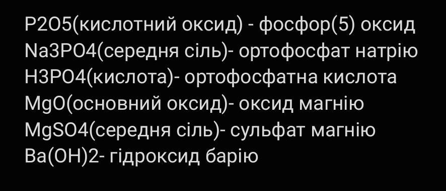 1. Назвати речовини, вказати клас ( P2O5, Na3PO4, H3PO4, MgO, MgSO4, Ba(OH)2.