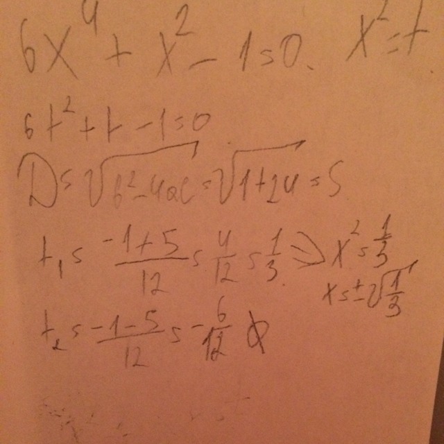 Вот решение , второй корень не подходит тк квадратное число( t=xквадрат) всегда полохительно