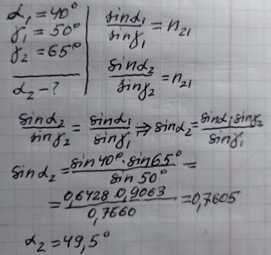 При куті падіння світлового променя на межу розподілу двох прозорих середовищ в 40° кут заломлення становить 50°. При якому куті падіння кут заломлення становитиме 65°? 65 БАЛІІІІВ!!!!