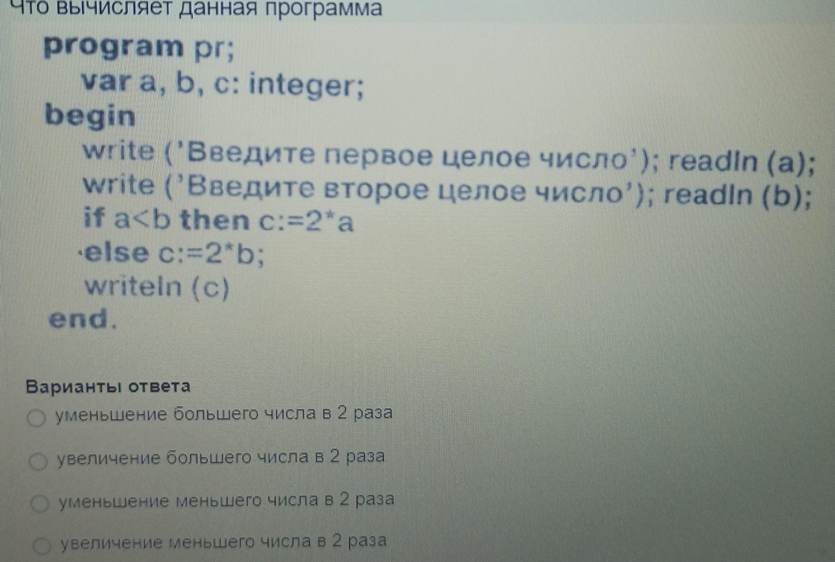 Программа вычисляет увеличение меньшего числа в 2 раза.