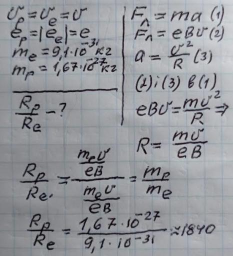 Відповідь: разів радіус кривизни траекторії протона більший за радіус кривизни траекторії електрона ≈ у 1840 разів