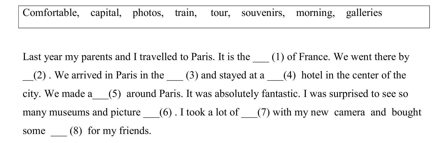 Відповідь: 1 )capital 2) train 3) morning 4) Comfortable 5) Tour 6) galleries 7) photos 8)souvenirs