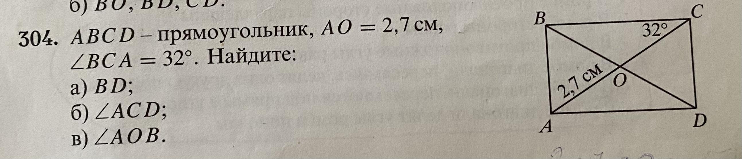 Мы знаем, что в прямоугольник его углы, соединяющие его стороны, равны 90° каждый. По рисунку угол BCD = 90°, а угол ВСО по условию равен 32°. Значит чтобы найти угол АСD, нужно от угла BCD отнять ВСО: