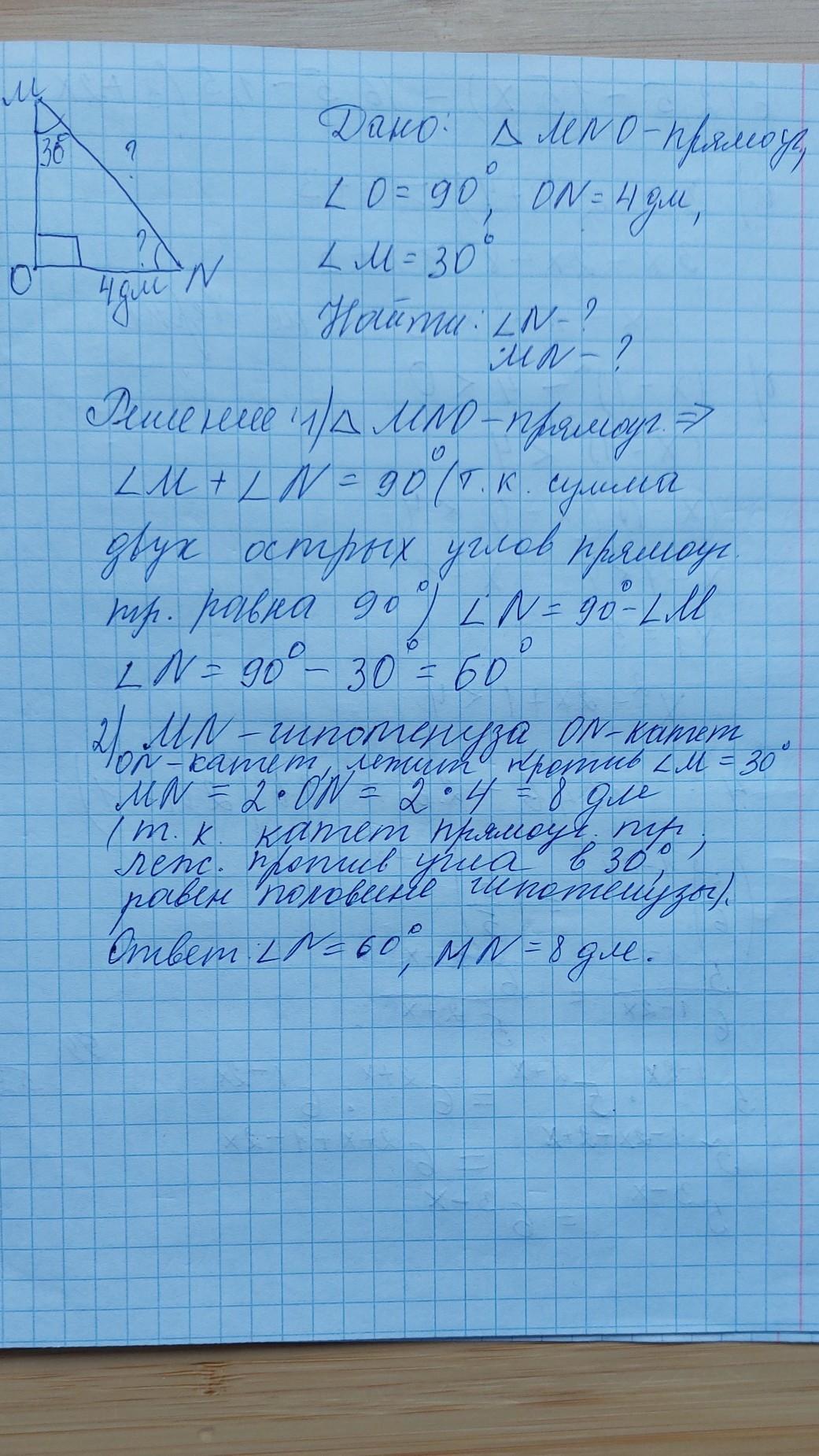Дан треугольник MNO угол M=30 градусов, O обозначен квадратом, сторона NO=4 дм, Найти: угол N, угол MN