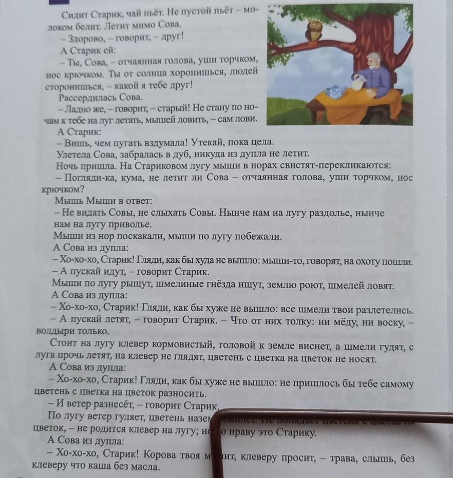 Отв :Сказка учит тому что нужно относиться ко всем с уважением,старик этого не понимал,и прогнал Сову. Но когда к нему пришла беда ,он понял что оскорбил другое живое существ по глупости, и пошел