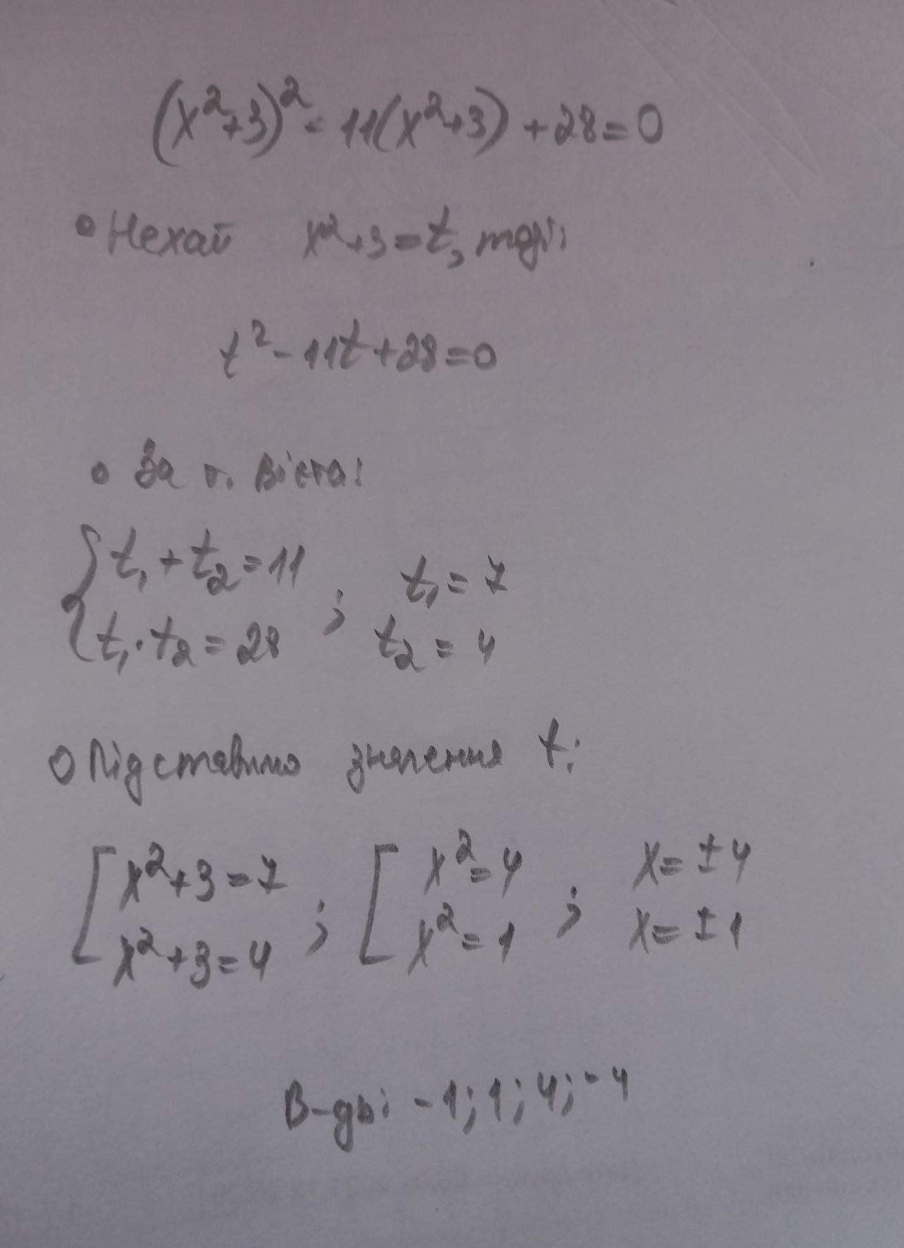 розв'яжіть рівняння з методом введення нової зміної за т.Вієта (x^2+3)^2 - 11 * (x^2+3) + 28 = 0