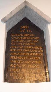 “От лета господня 1651. Ратман, кто бы ты ни был, входя в сей дом для исполнения твоего долга, оставь за порогом все личные треволнения: гнев, обиду, вражду, дружбу, лесть; себя самого и свои заботы посвяти обществу, ибо каков ты к другим — справедлив или несправедлив, таким ты предстанешь перед господним судом”.