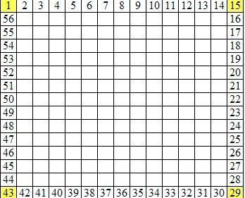 По краям 56 плиток. 4 угловых плитки относятся сразу к двум сторонам. То есть между угловыми плитками лежат 56-4 = 52 плитки. Значит, на одну сторону приходится 52:4 = 13 плиток, плюс две угловых, итого 13+2 = 15 плиток на сторону. Всего потребуется 15*15 = 225 плиток. (см. рис.)