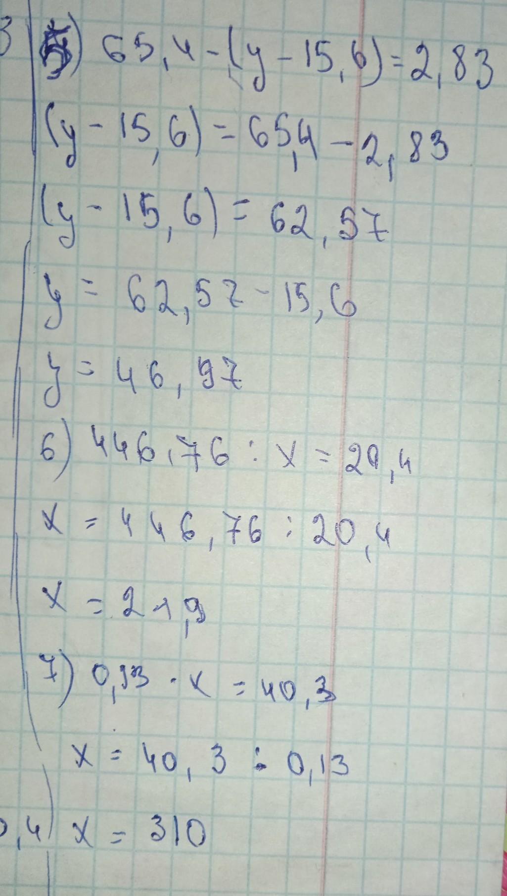 Розв’яжіть рівняння: 1) 4,4 + х = 74,2; 2) 37,2 – у = 23,5; 3) а – 0,39 = 12,8; 4) (13,5 + х) – 25,8 = 10,4; 5) 65,4 – (у – 15,6) = 2,83; 6) 446,76 : х = 20,4; 7) 0,13 ∙ х = 40,3