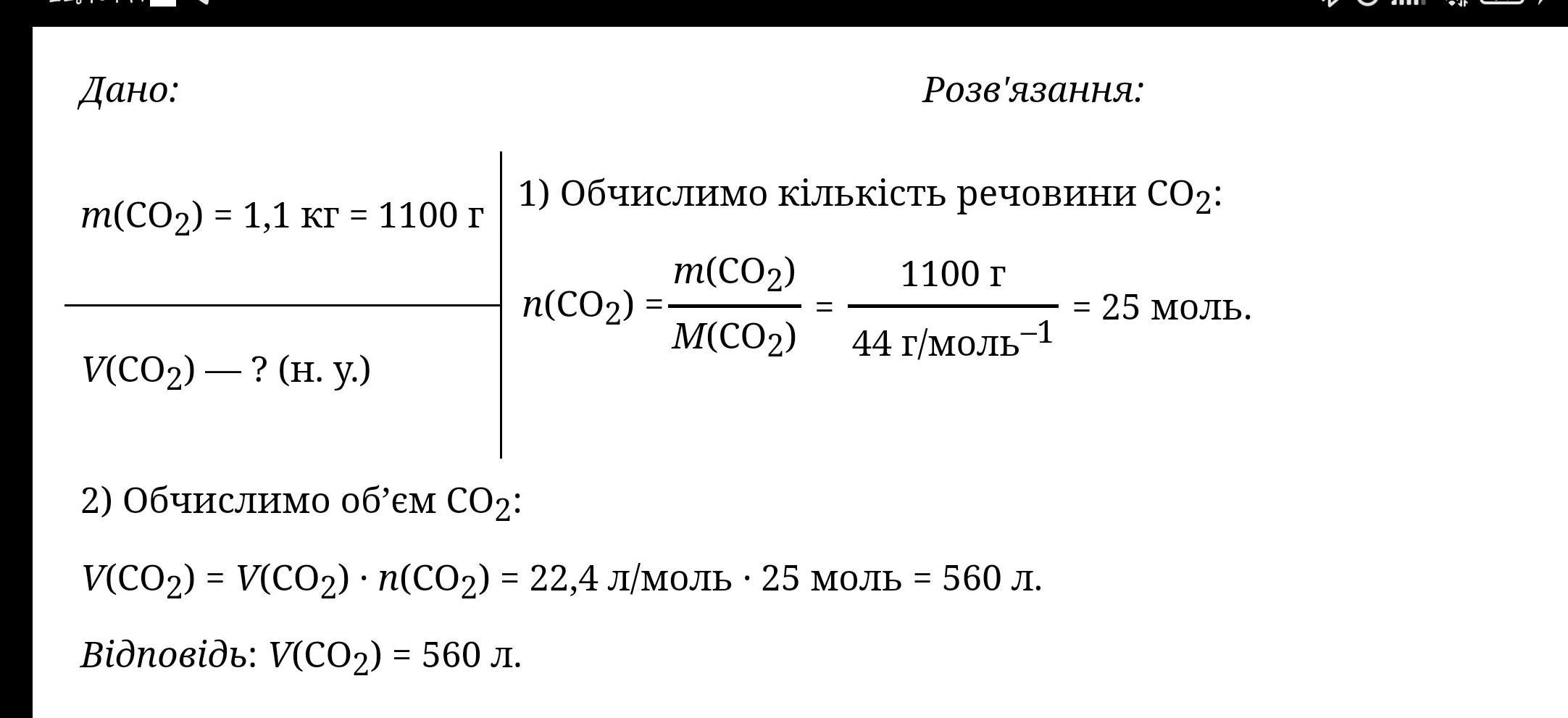 Учні класу за 45 хвилин уроку видихають разом із повітрям 1,1 кг вуглекислого газу. Який об'єм займає цей газ за нормальних умов?