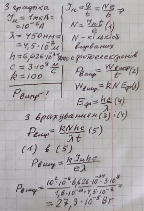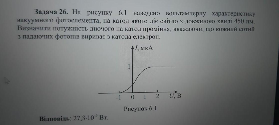 Задача 26. На рисунку 6.1 наведено вольтамперну характеристику вакуумного фотоелемента, на катод якого діє свiтло з довжиною хвилі 450 нм. Визначити потужність діючого на катод проміння, вважаючи, що кожний сотий з падаючих фотонів вириває з катода електрон. 41, мкА L -1 0 1 2 U,B Рисунок 6.1 Вiдповiдь: 27,3-105 Вт.