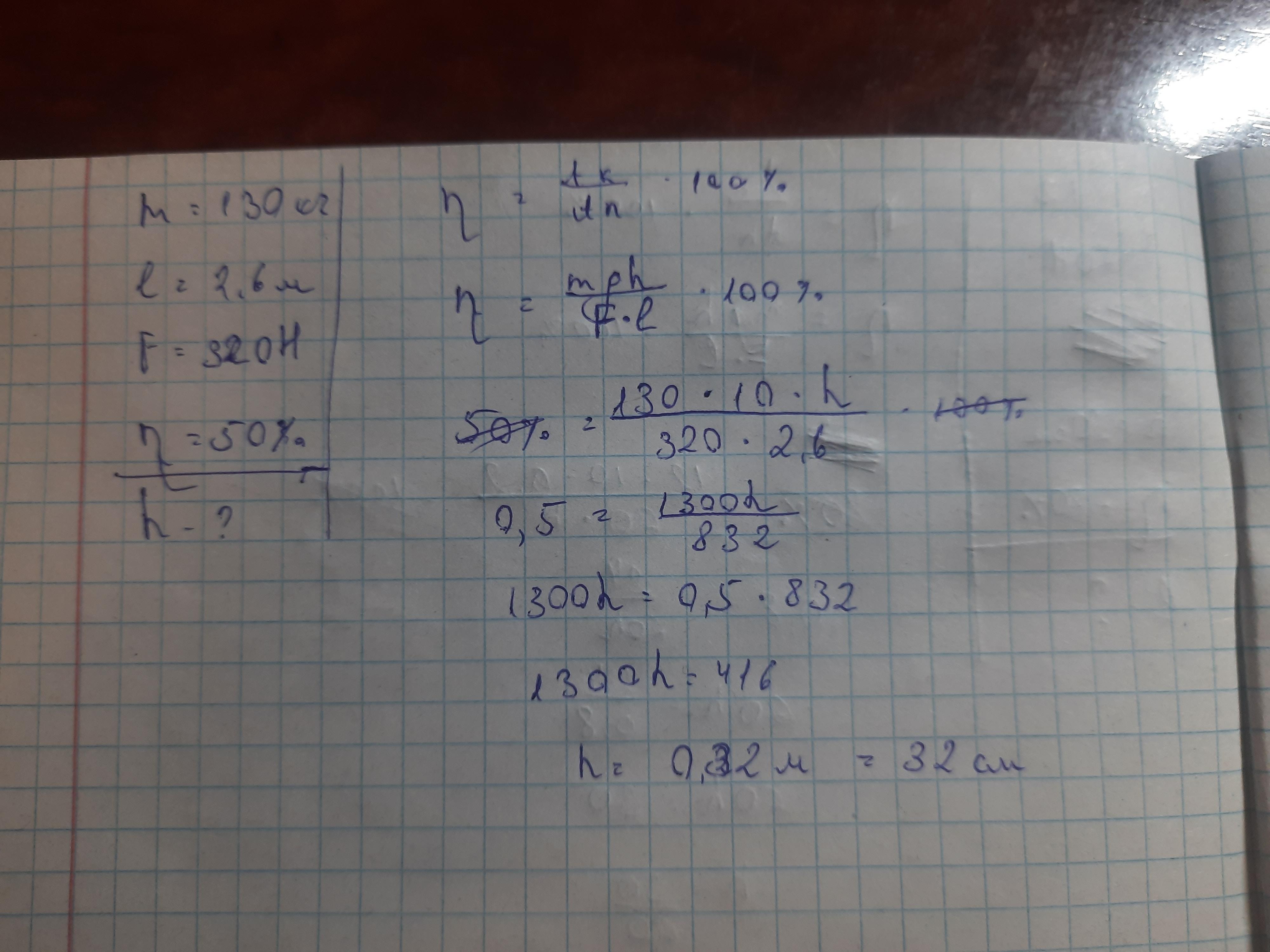 Вантаж масою 130 кг піднімають по похилій площині довжиною 2,6м, прикладаючи силу 320 H. Якою є висота похилої площини, якщо ККД=50% ПОМОГИТЕ ПРОШУ!!!!