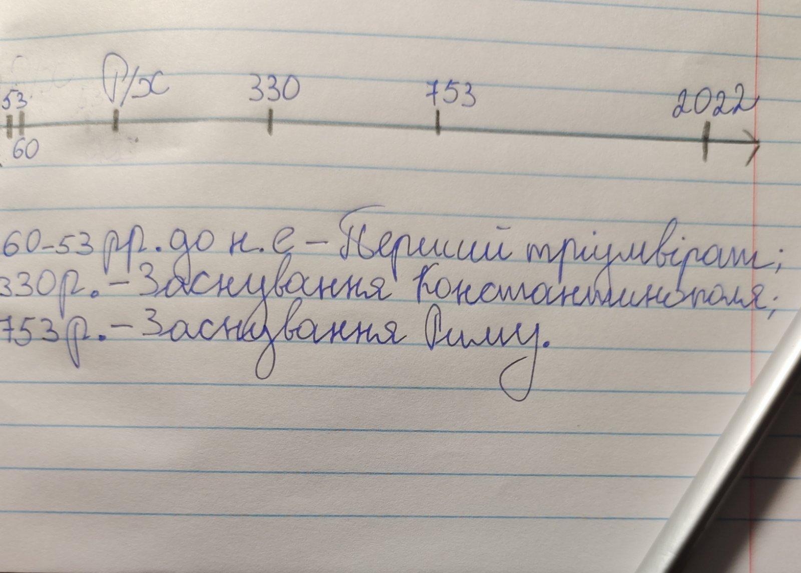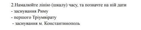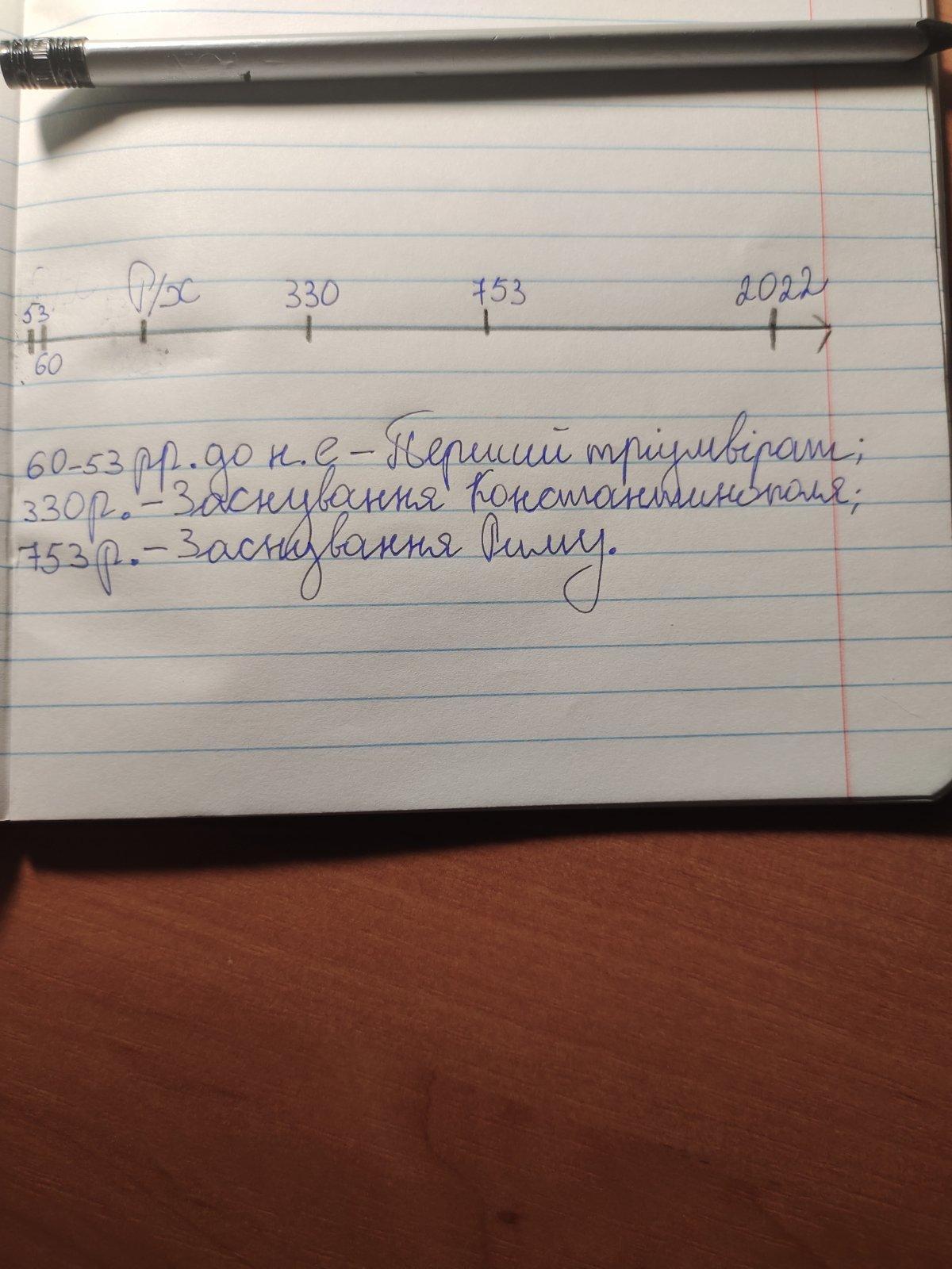 Перший Тріумвірат був до н.е (нашої ери), а Р/Х (Різдво Христове) - це початок нашої ери, тобто нульовий рік, тому Тріумвірат пишемо першим, десь на початку. Заснування Константинополя і Риму були в нашу еру, пишемо де захочемо, головне дистанція. А наш рік пишемо поряд с самим кінцем лінії часу.