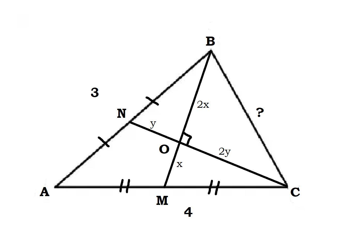 в треугольнике со сторонами 3 и 4 проведены медианы перпендикулярные друг другу. найдите третью сторону.