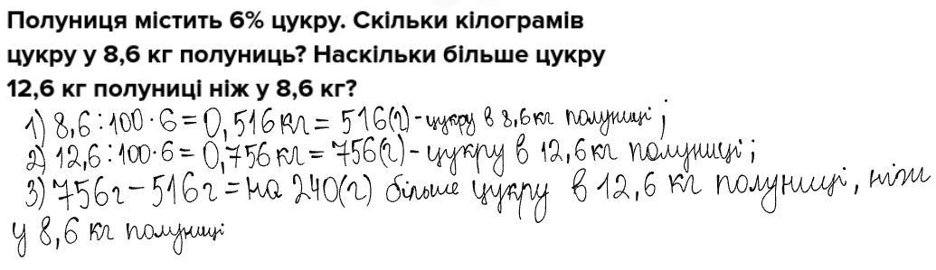 Полуниця містить 6% цукру. Скільки кілограмів цукру у 8,6 кг полуниць? Наскільки більше цукру 12,6 кг полуниці ніж у 8,6 кг?