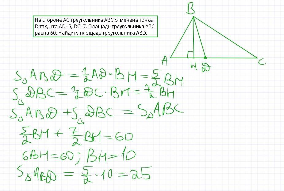 На стороне АС треугольника АВС отмечена точка Д так , что АД =5 , ДС=7. Площадь треугольника АВС равна 60 см² . Найдите площадь треугольника АВД