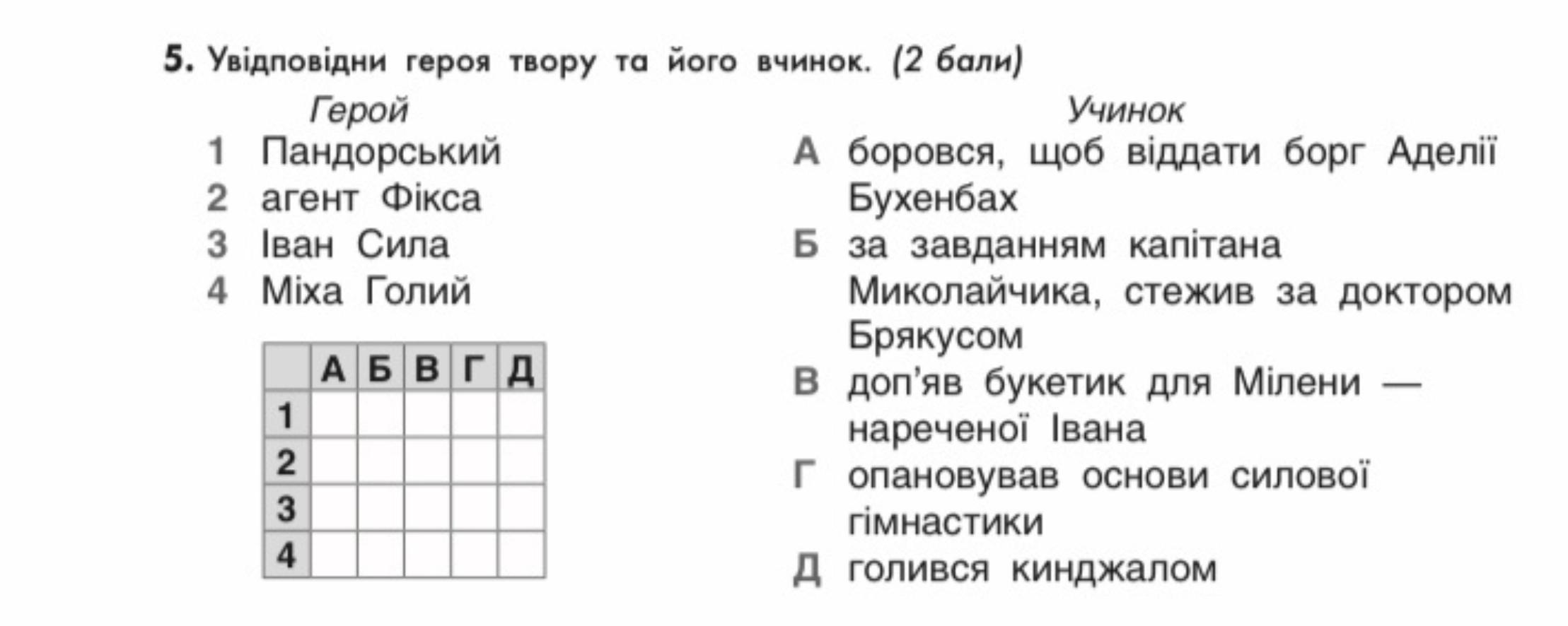 Дуже цікавий тест, виходячи із змісту твору. Наприклад, відповідь Іван Сила підходить під два питання, зате Міха Голий не підходить, у моєму розумінню, ні під яке питання.