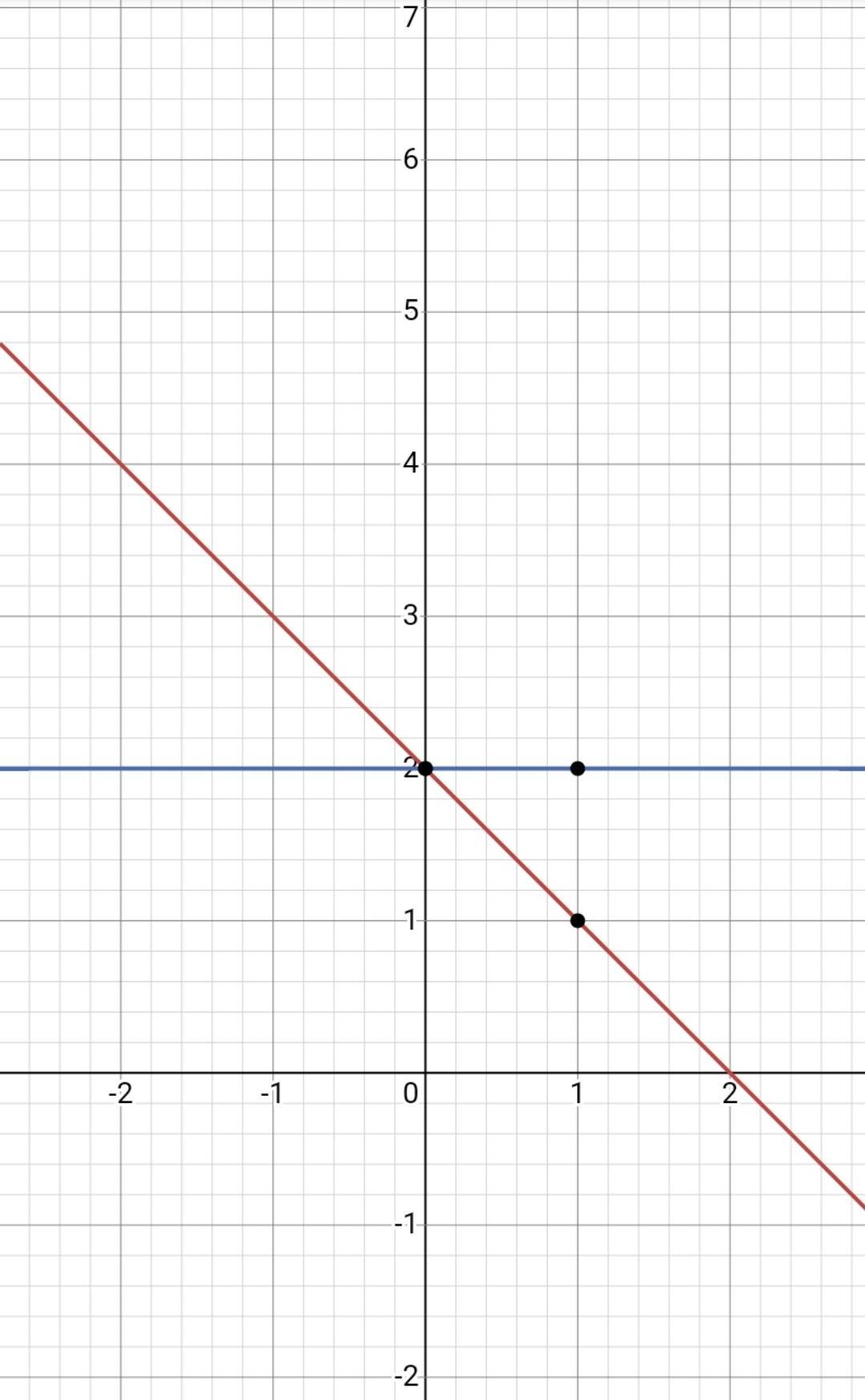 в одній системі координат графіки функцій у= 2-х і у=2. За рисунком знайдіть координати точки перетину графіків.
